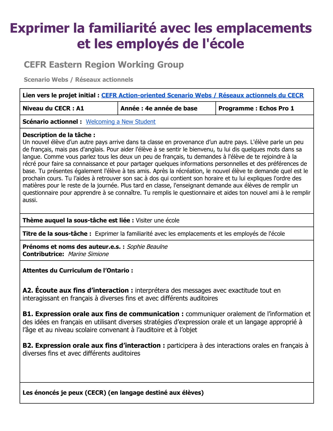Scénario actionnel (Grade 4 Core French / CECR A1) où les élèves accueillent un nouvel élève, échangent des informations personnelles et des préférences, et pratiquent le vocabulaire des salles et des employés de l’école à l’oral à l’aide de chansons, d’une présentation et d’un jeu d’assemblage.
