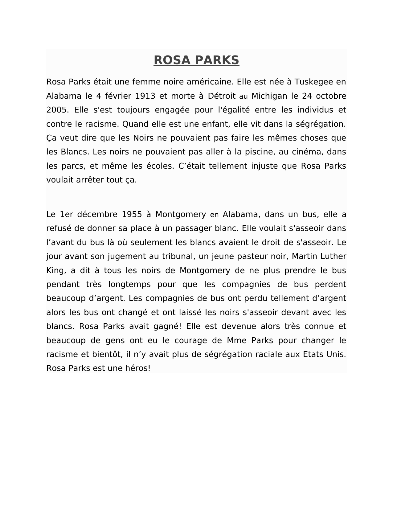 Pour une unité sur l'histoire des Noirs, voici une biographie de Rosa Parks avec des questions de comprehension. J'ai écrit cette biographie avec du vocabulaire approprié pour les élèves d'Immersion Française de troisième année.