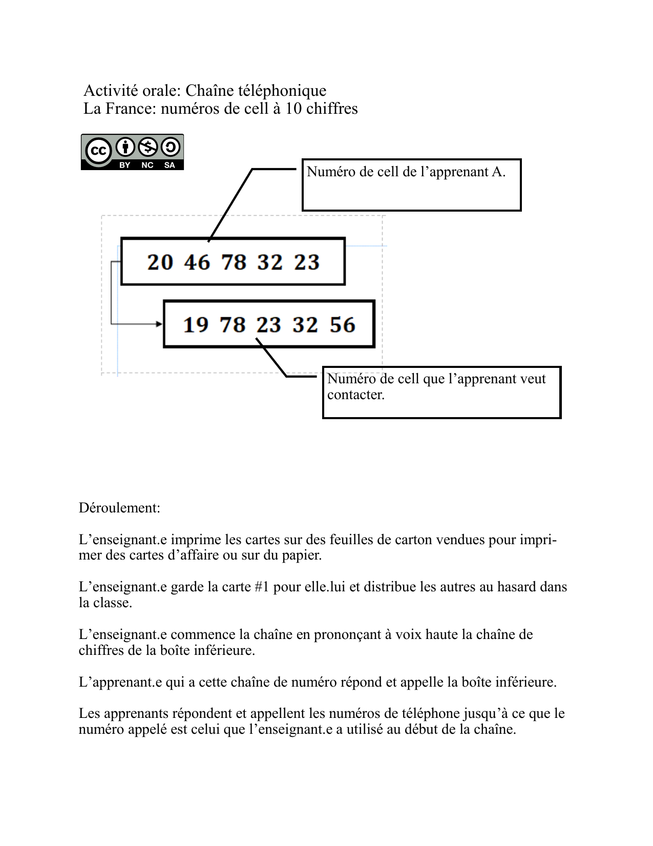 Jeu/activité de communication orale où les élèves reçoivent des cartes de numéros de téléphone et doivent répondre « Allo? » puis appeler le prochain numéro pour compléter une chaîne téléphonique, en pratiquant les nombres et de courtes formules de conversation.