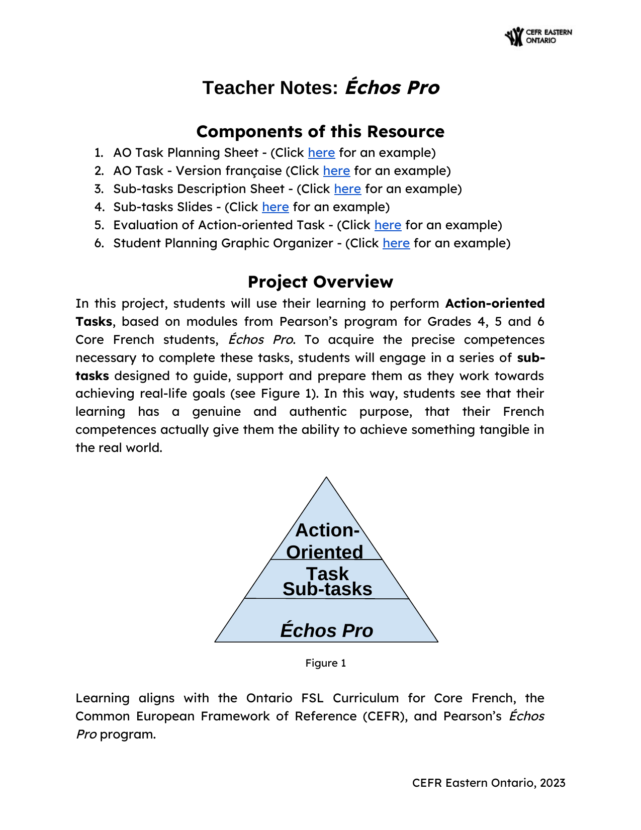 Teacher notes and linked templates to support Core French students in completing action-oriented tasks aligned with the Ontario FSL Curriculum, CEFR (A1), and Pearson Échos Pro. Includes suggested implementation steps, sub-task overviews for Grades 4–6 scenarios, student planning graphic organizers, slides, and evaluation sheets for oral interaction/production and written production.