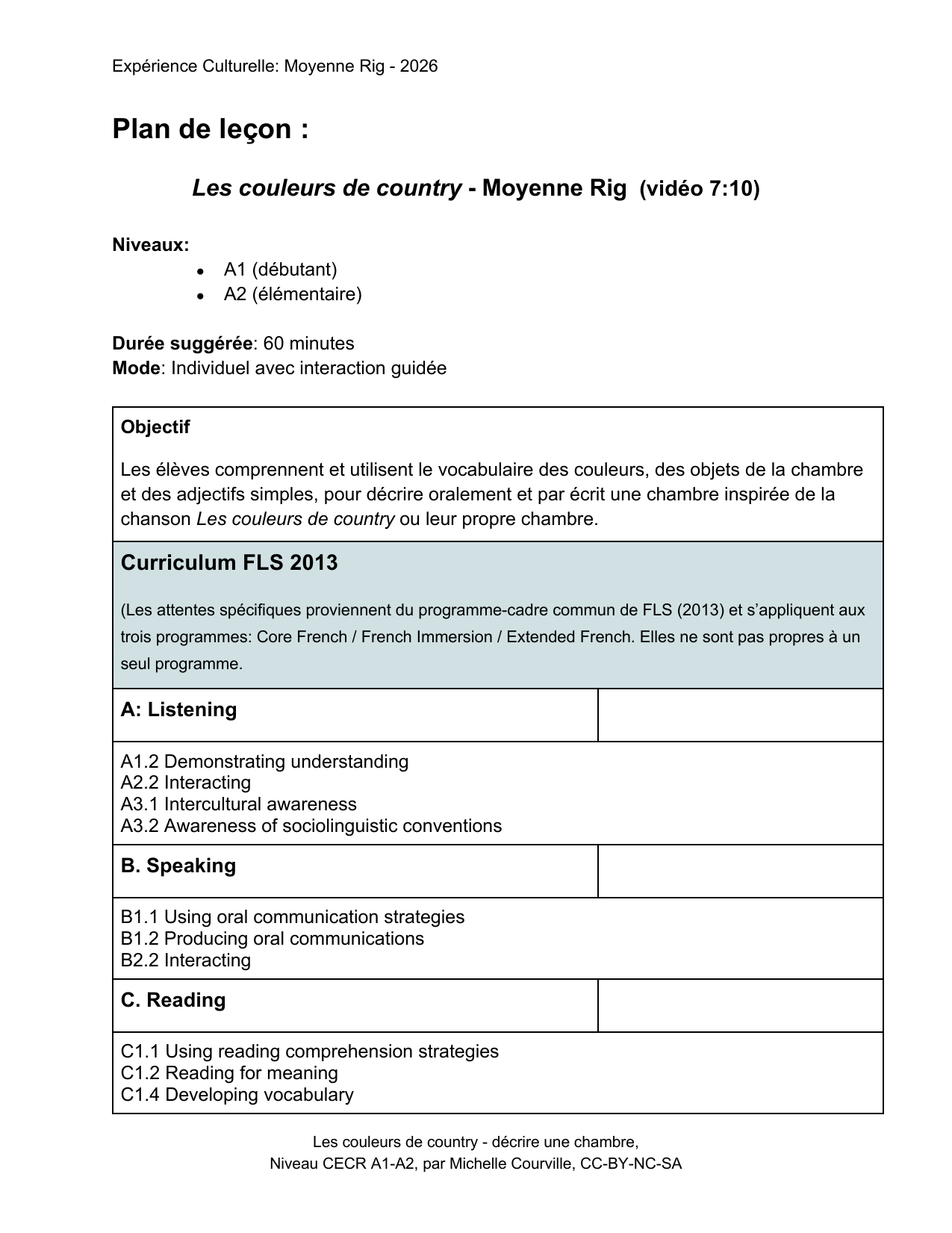 Les élèves comprennent et utilisent le vocabulaire des couleurs, des objets de la chambre et des adjectifs simples, pour décrire oralement et par écrit une chambre inspirée de la chanson Les couleurs de country ou leur propre chambre.